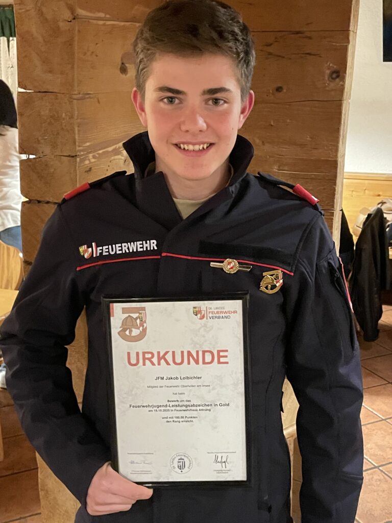 Wir gratulieren Jakob Loibichler zum bestandenen Feuerwehrjugend-Leistungsabzeichen in Gold! Am 18. Oktober fand in Attnang die Prüfung statt. Auf der BFK-Seite gibt es einen ausführlichen Bericht. Bemerkenswert ist, dass Jakob nun den Oberhofner Punkterekord mit 160 von 161 Punkten hält!